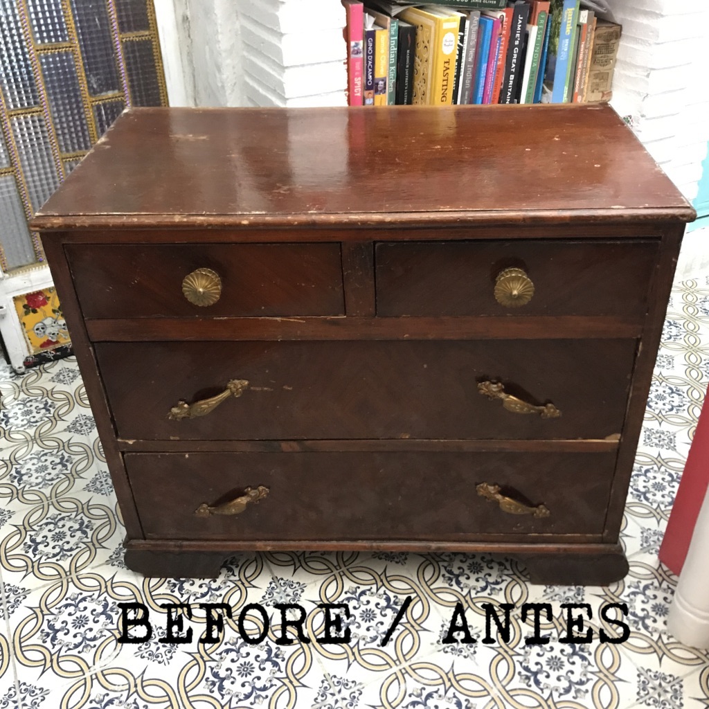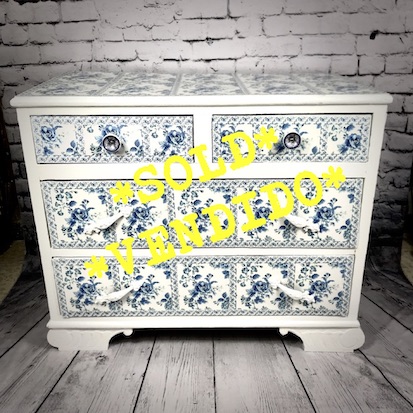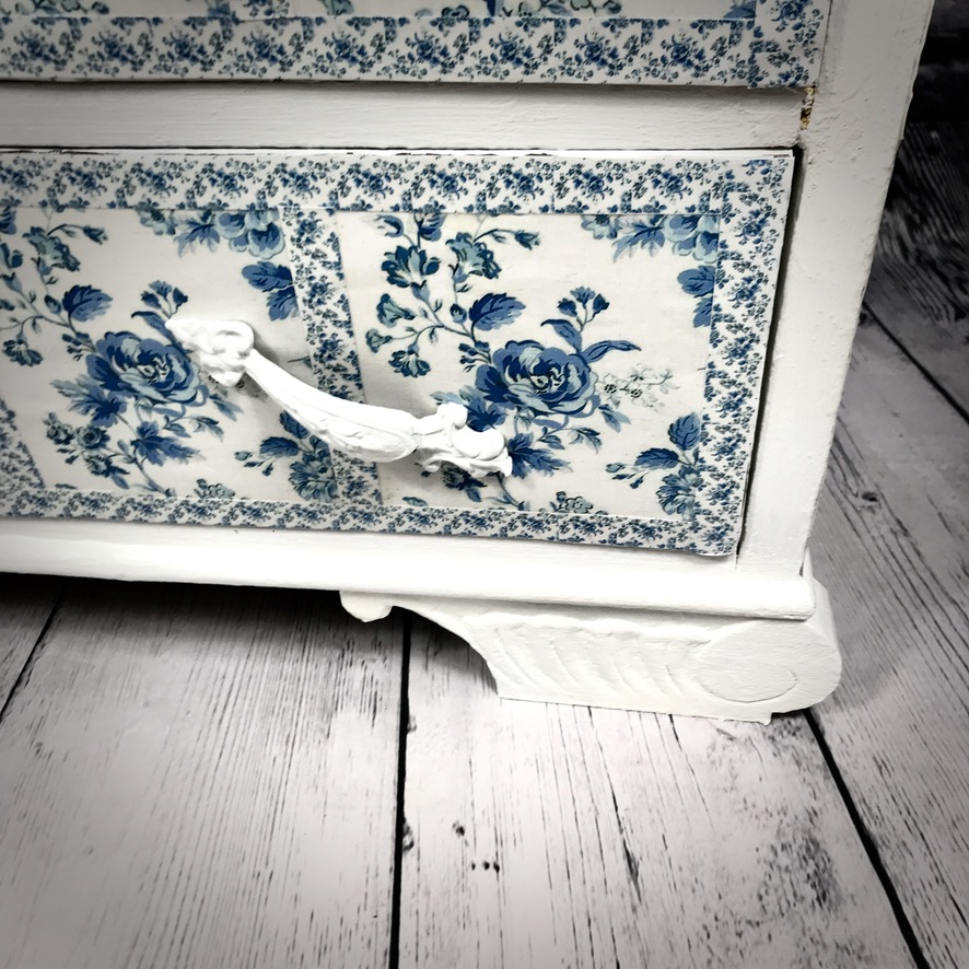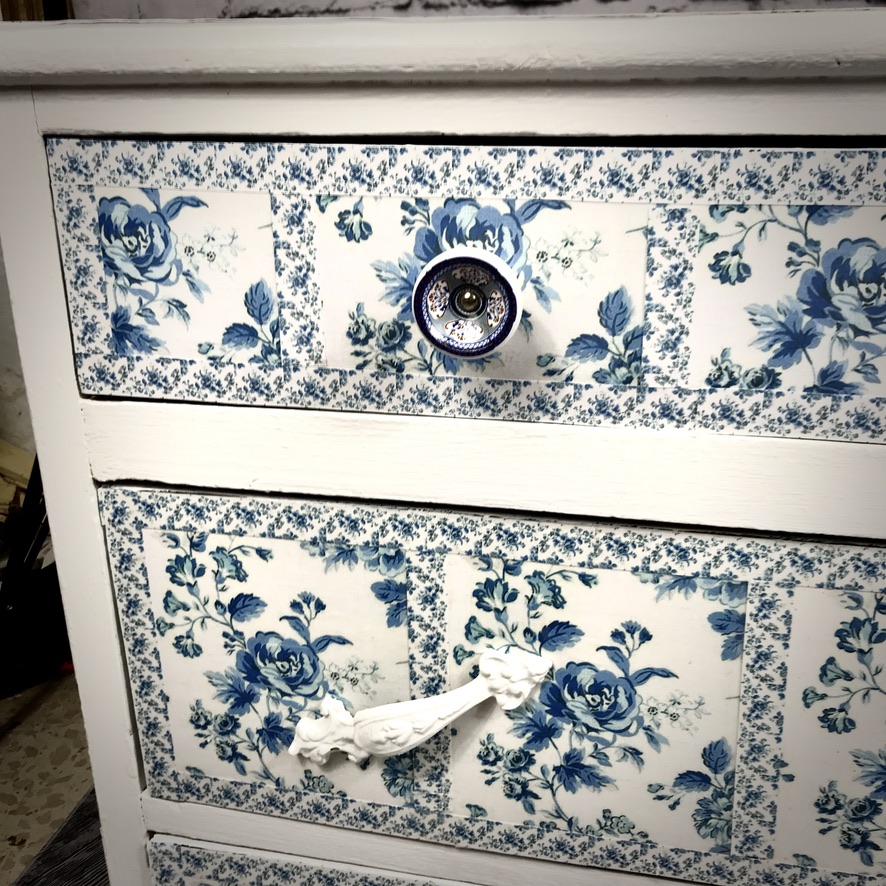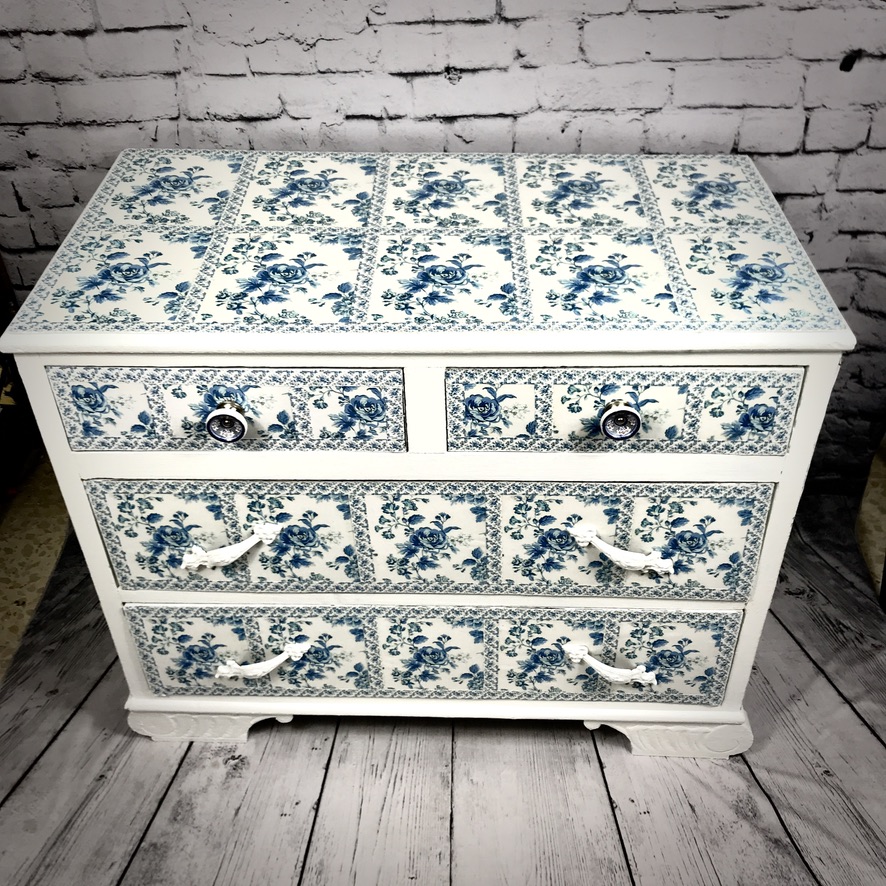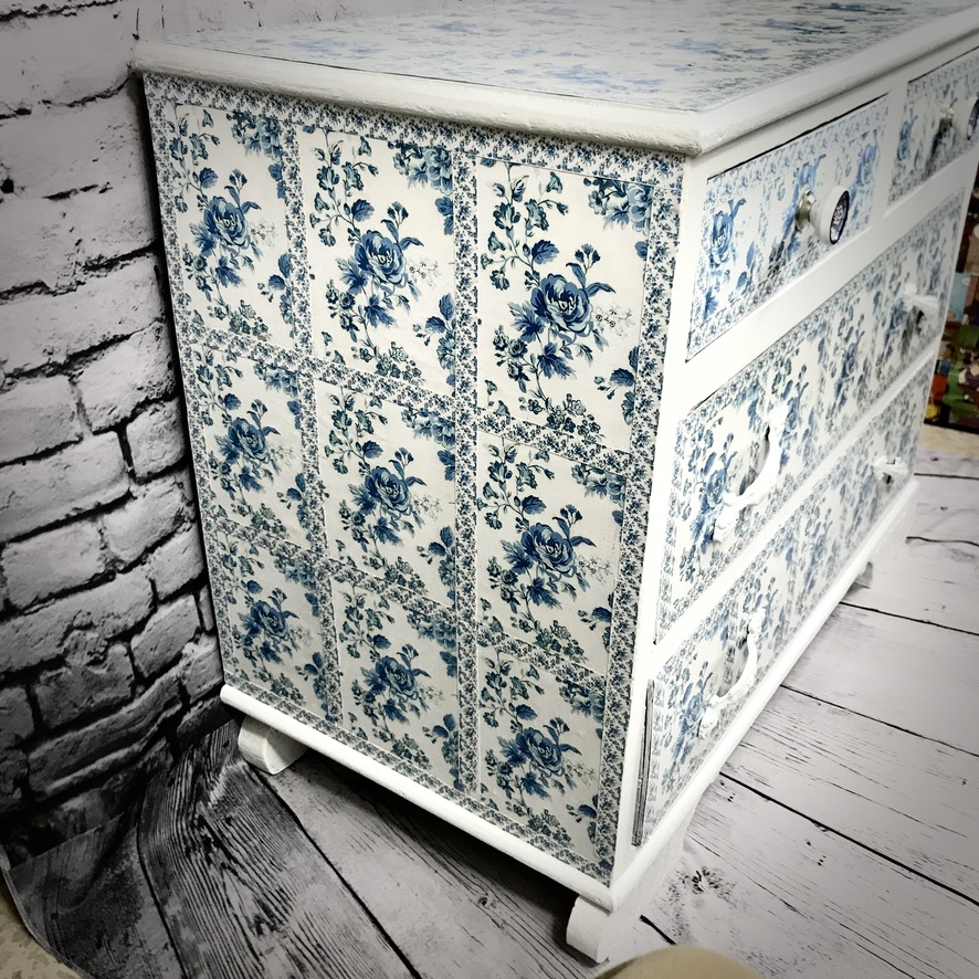 This old, brown, basic chest of drawers has been reloved with a bright, blue and white decoupage scheme.