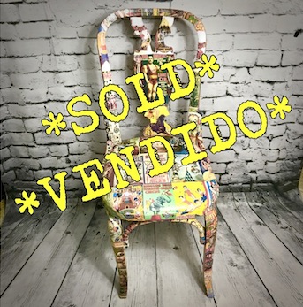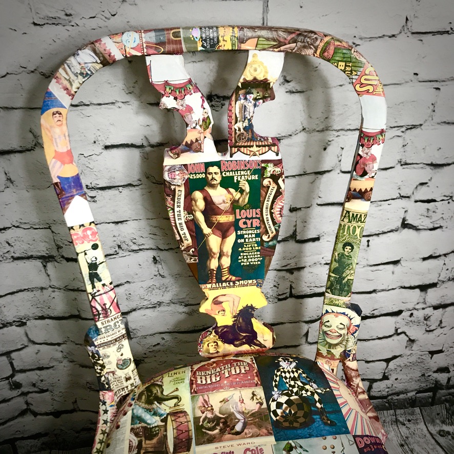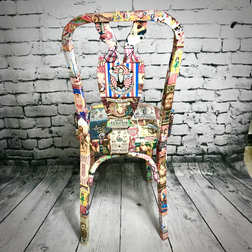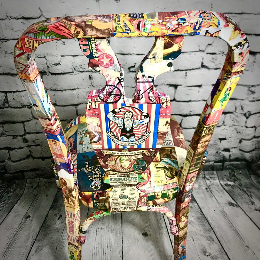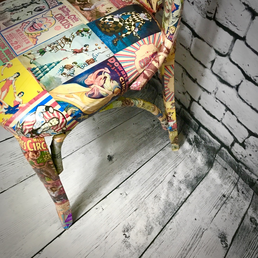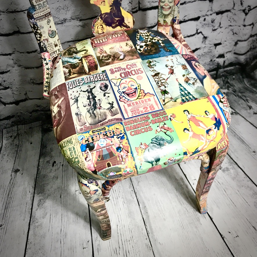 Previously featured in our blog, this wooden chair with upholstered seat was rescued from beside the bins and given a stunning makeover – now decoupaged in retro circus prints, this chair is now a totally unique piece!