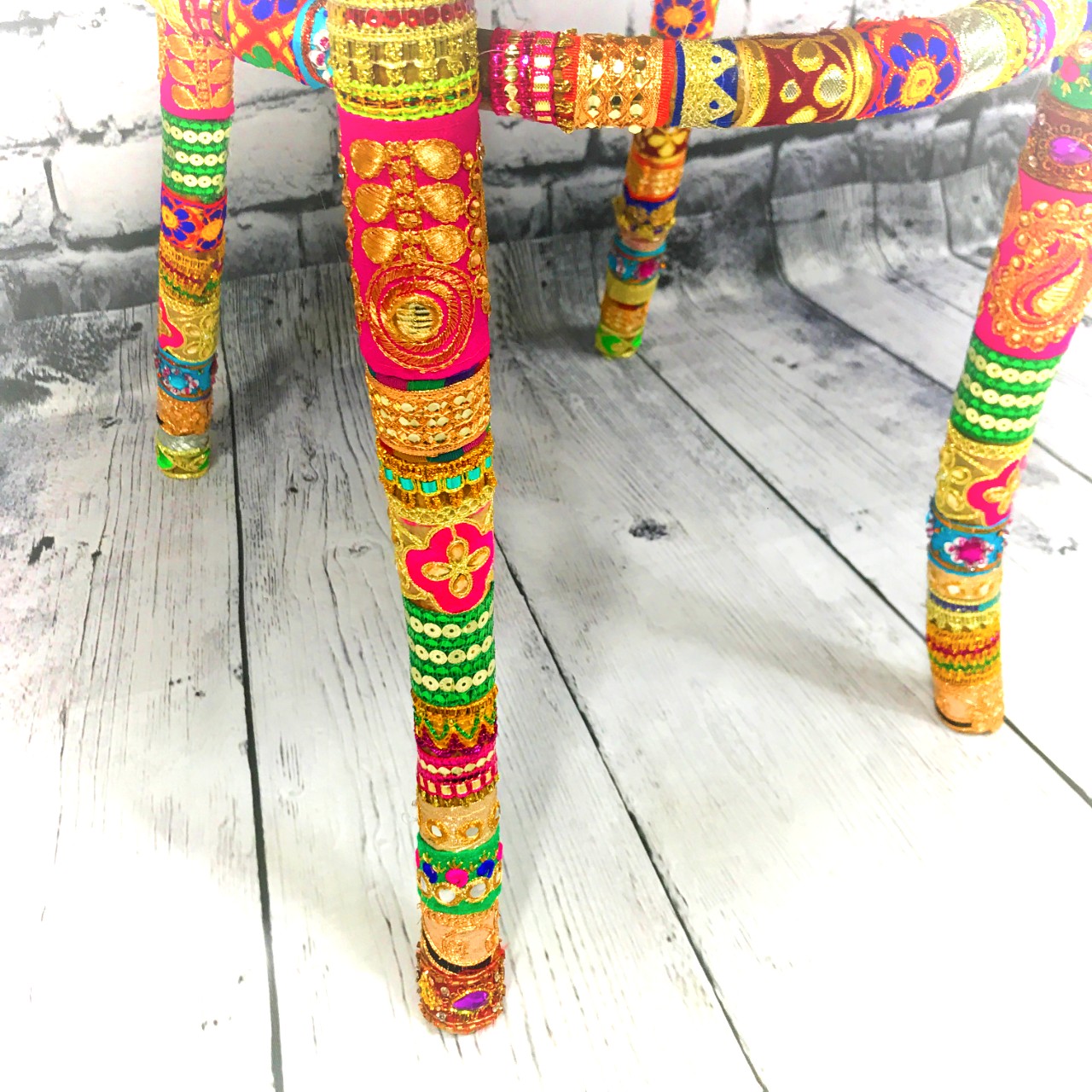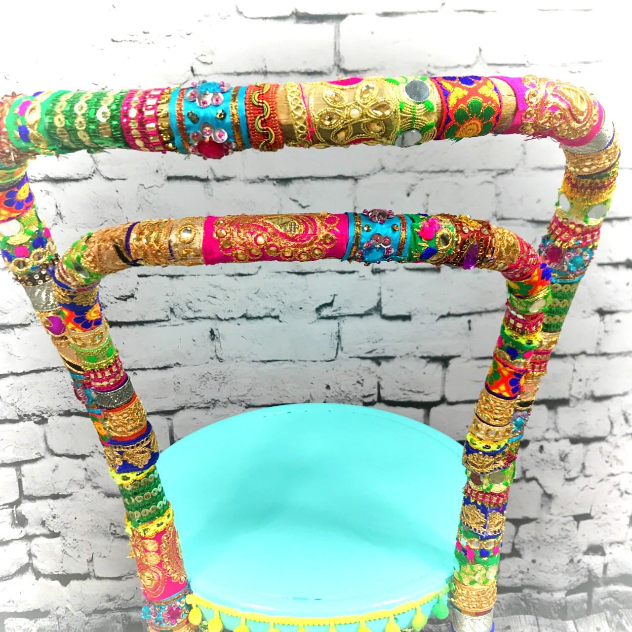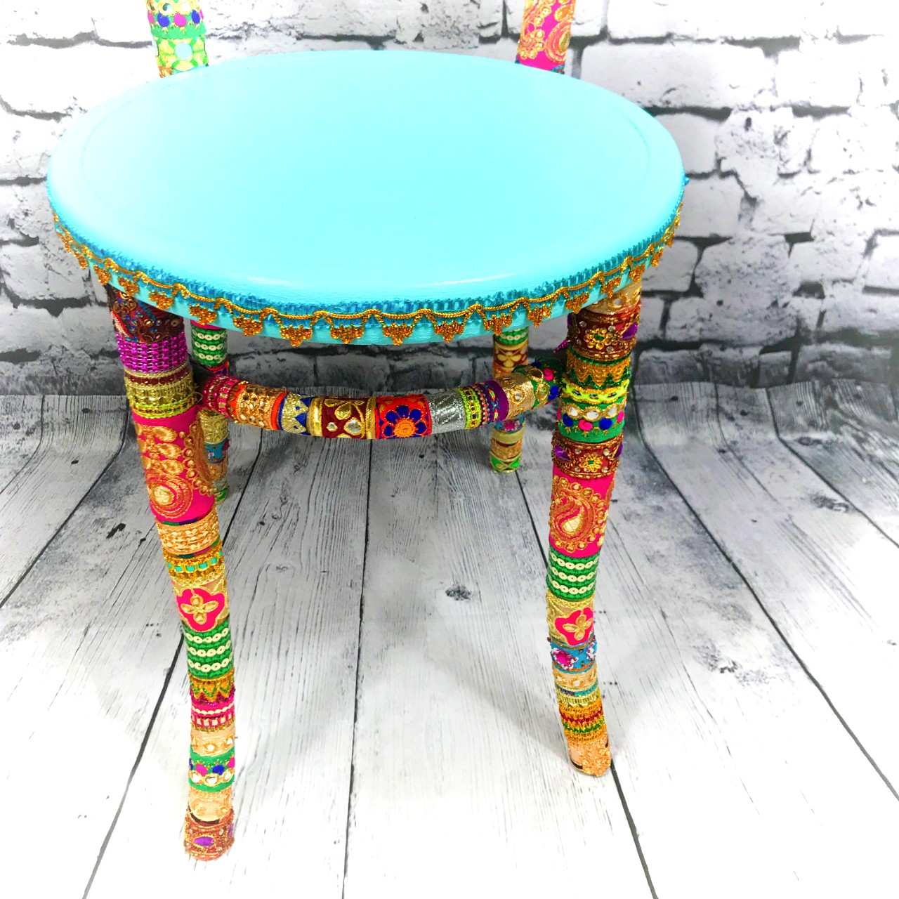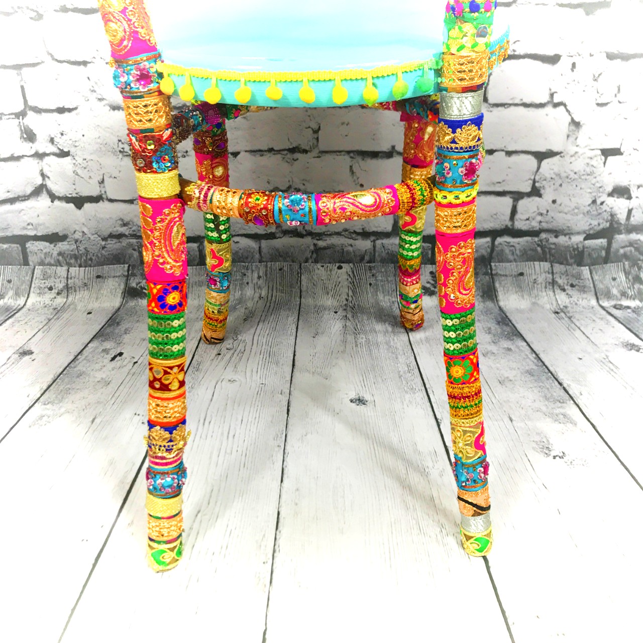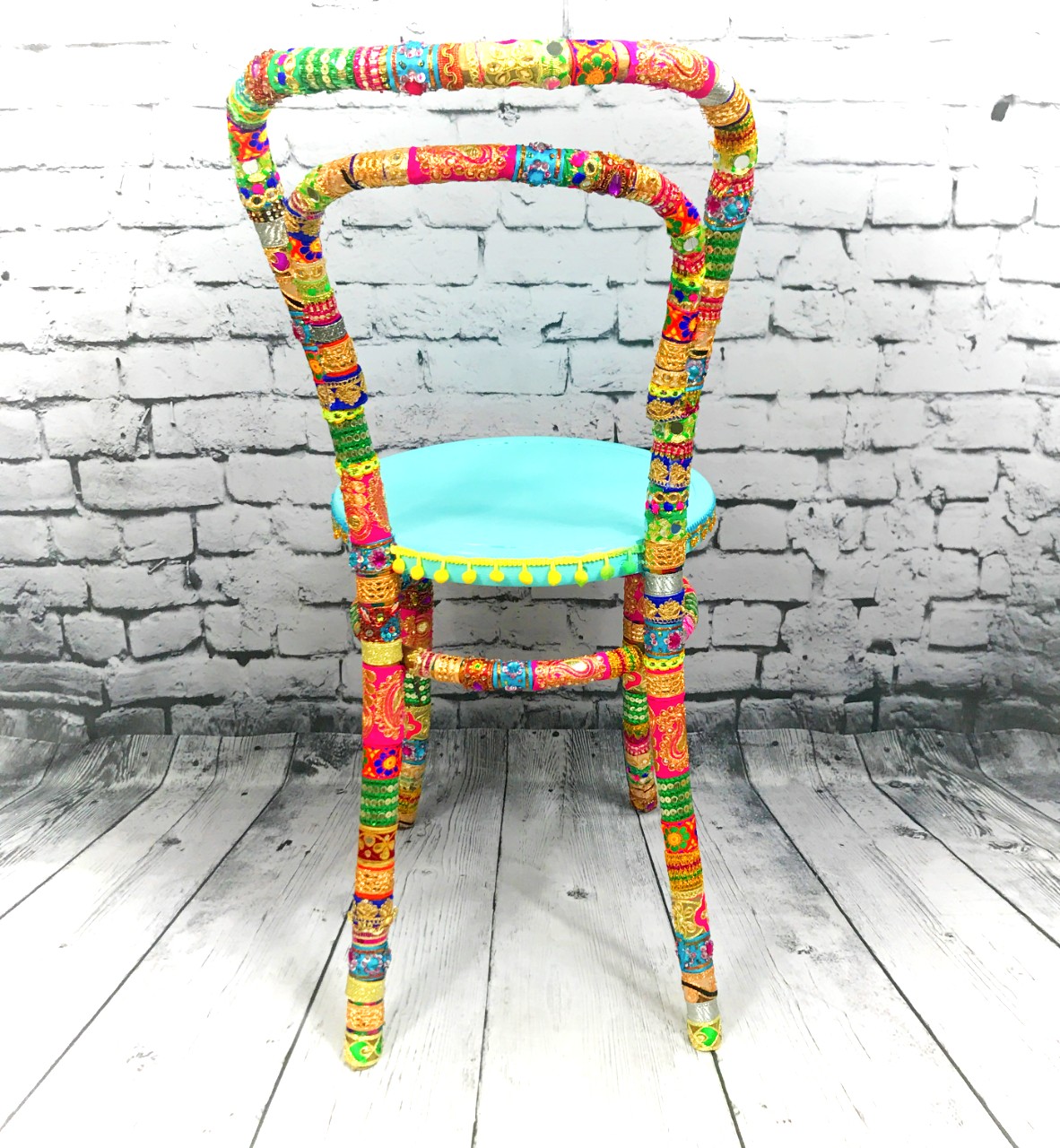 This wooden chair came to us with bags of character and showing its age. But now with a splash of paint and LOADS of Indian trimmings it makes a real WOW piece of furniture – a real head-turner and a very useful item!