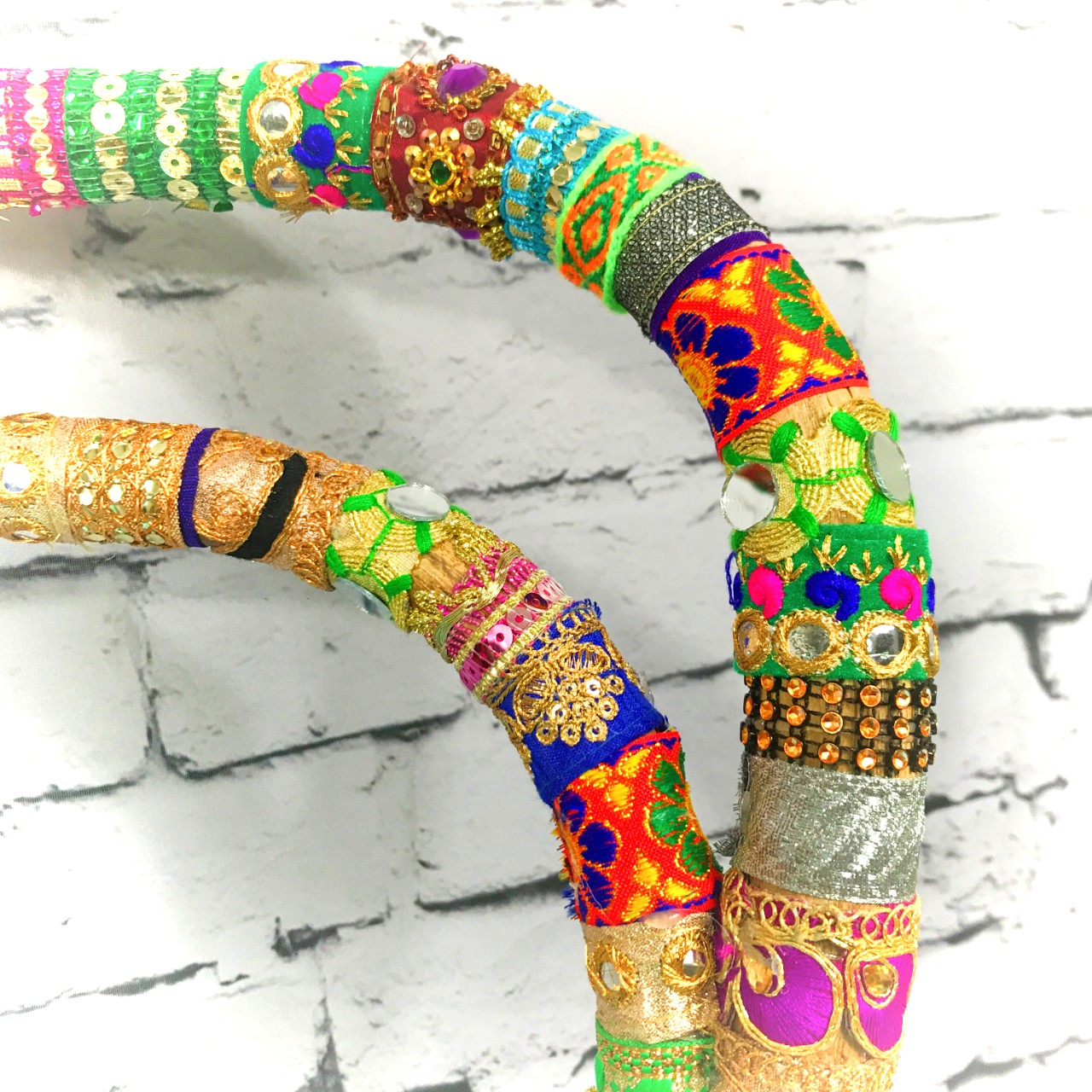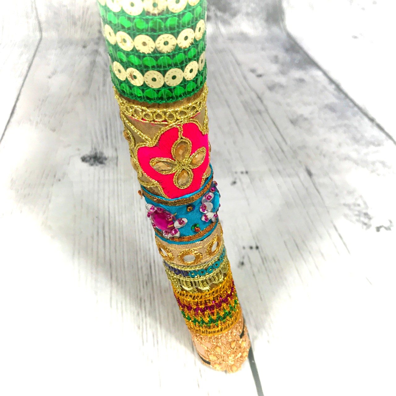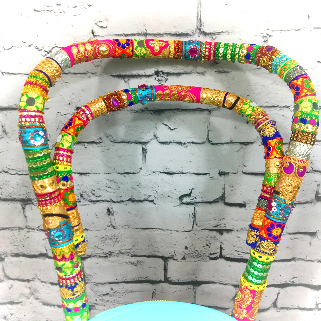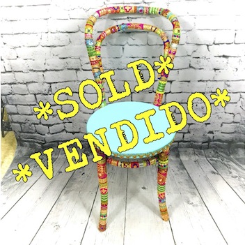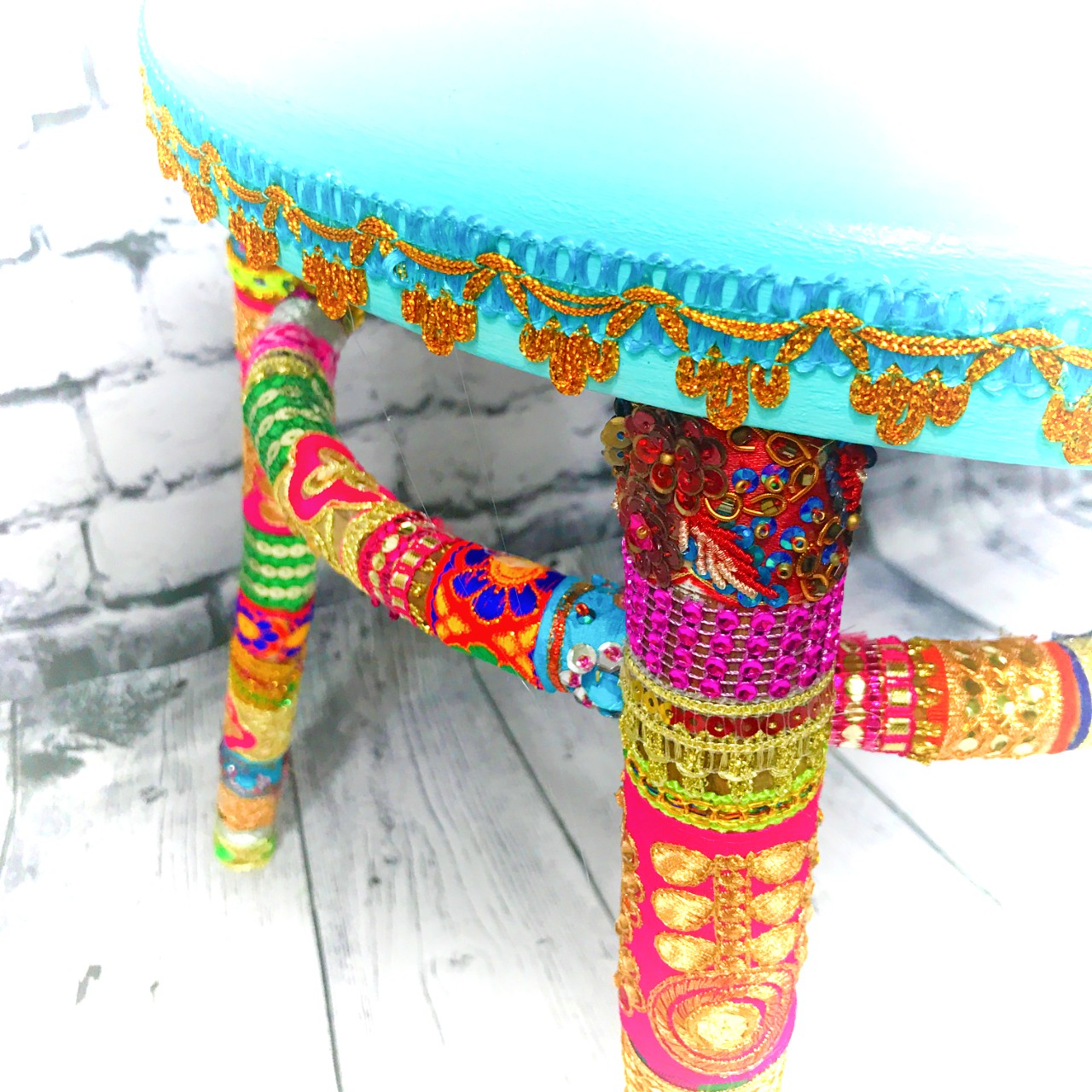 This wooden chair came to us with bags of character and showing its age. But now with a splash of paint and LOADS of Indian trimmings it makes a real WOW piece of furniture – a real head-turner and a very useful item!