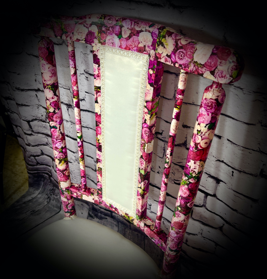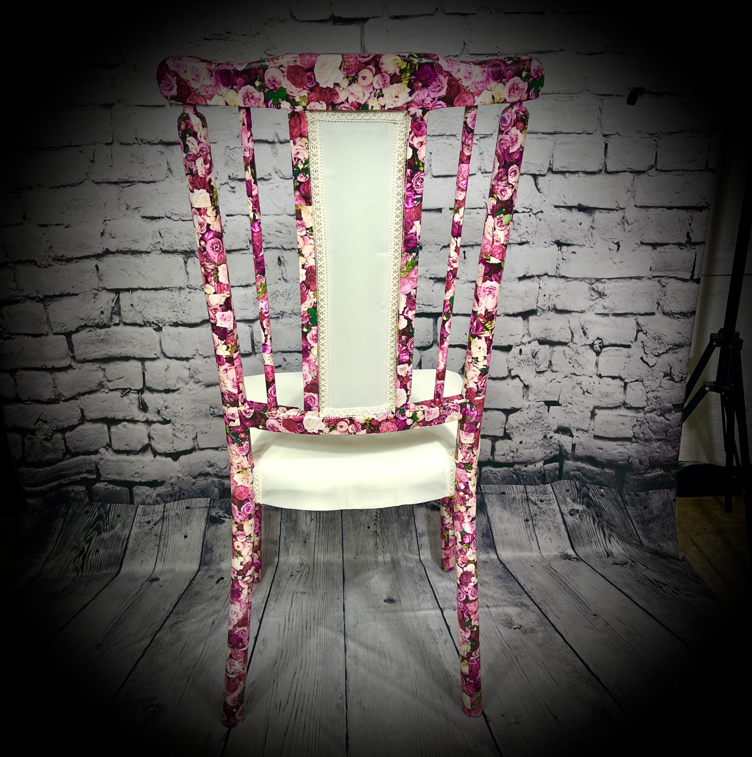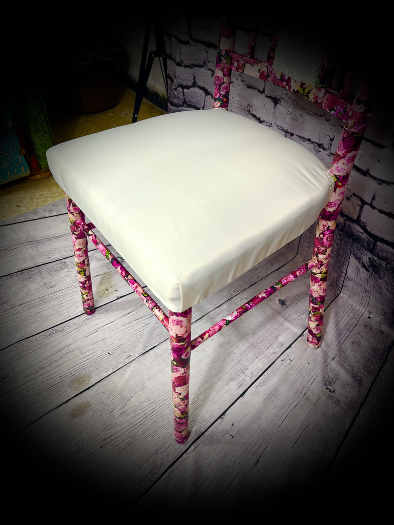 A solid wooden chair decoupaged in a “Roses” print and with off-white satin upholstery.