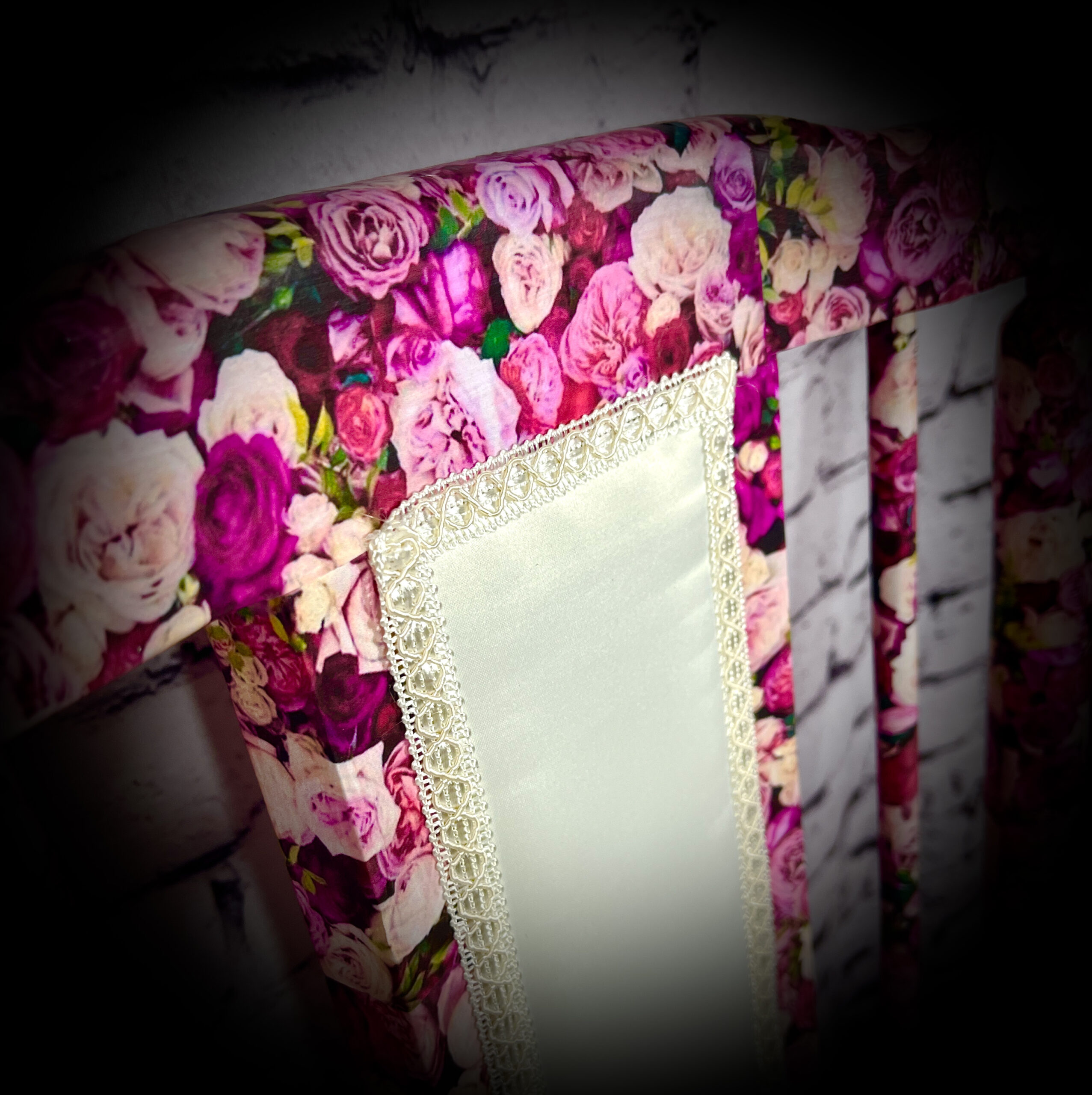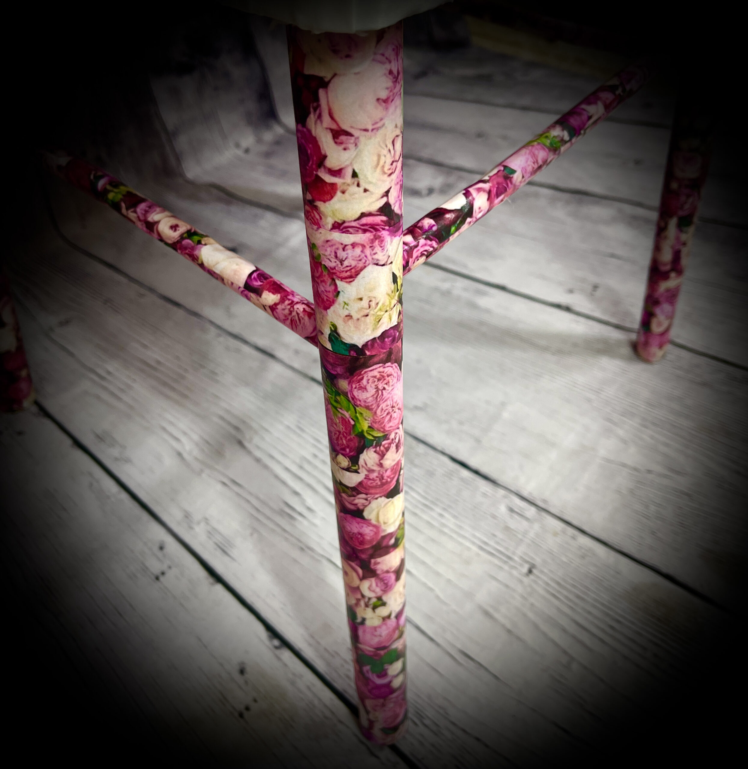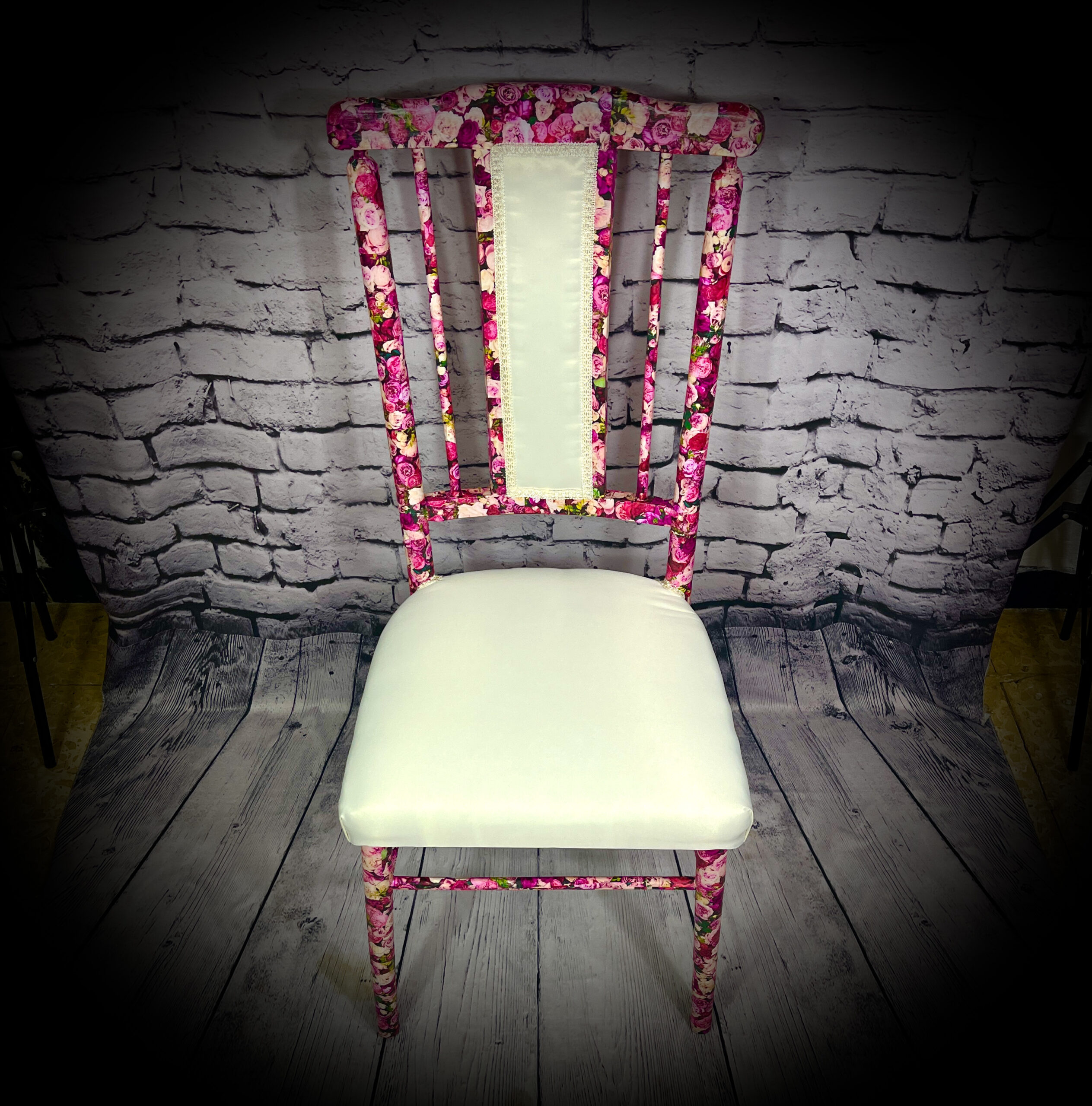 A solid wooden chair decoupaged in a “Roses” print and with off-white satin upholstery.