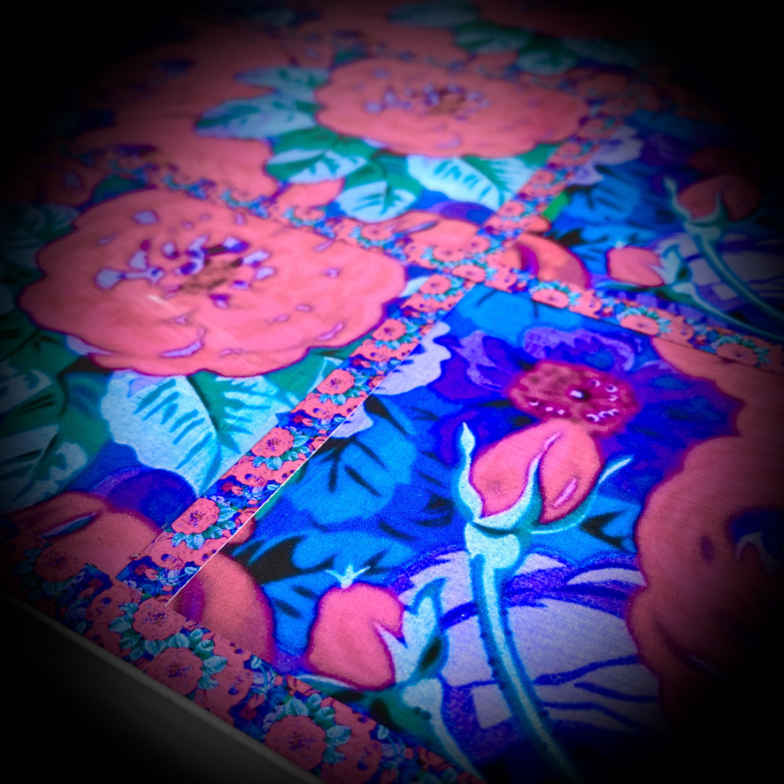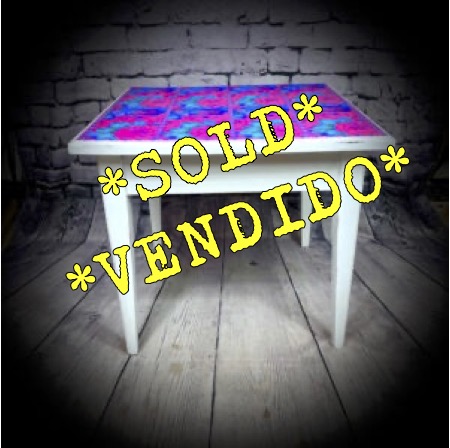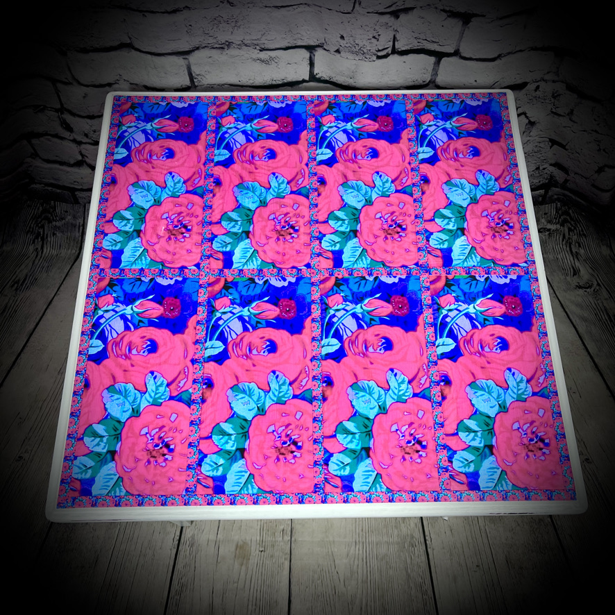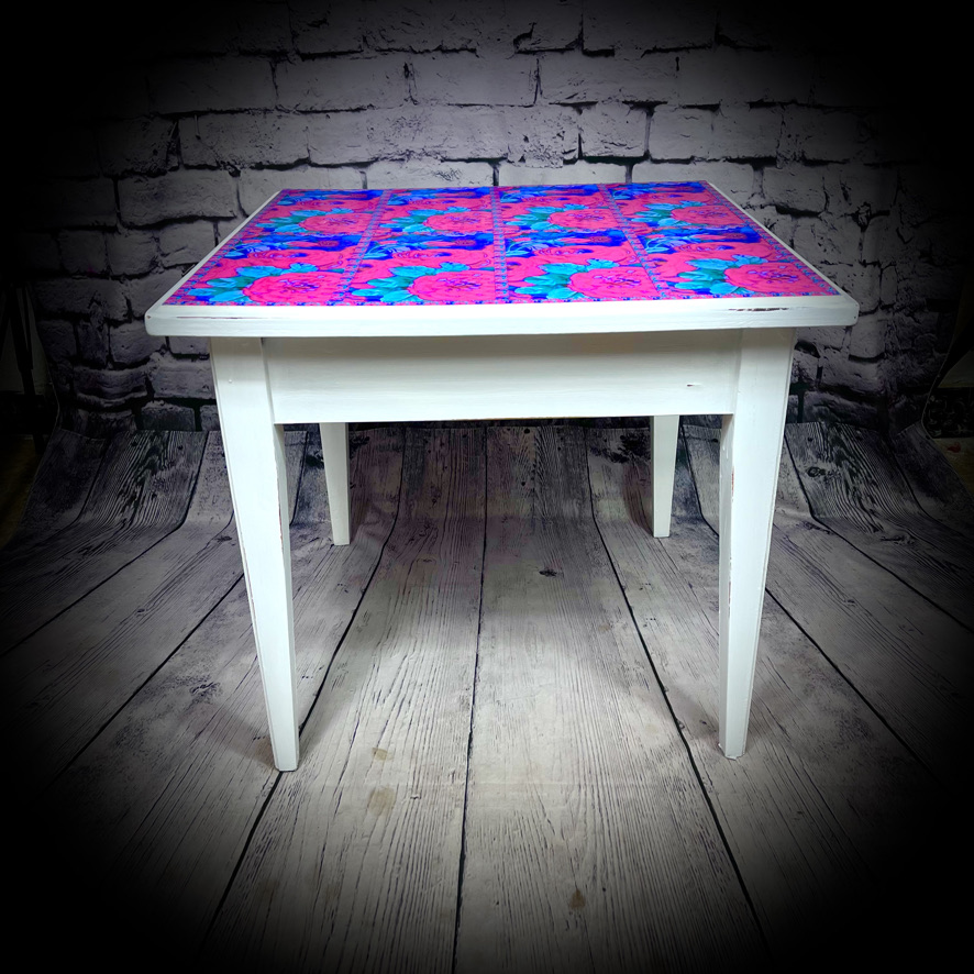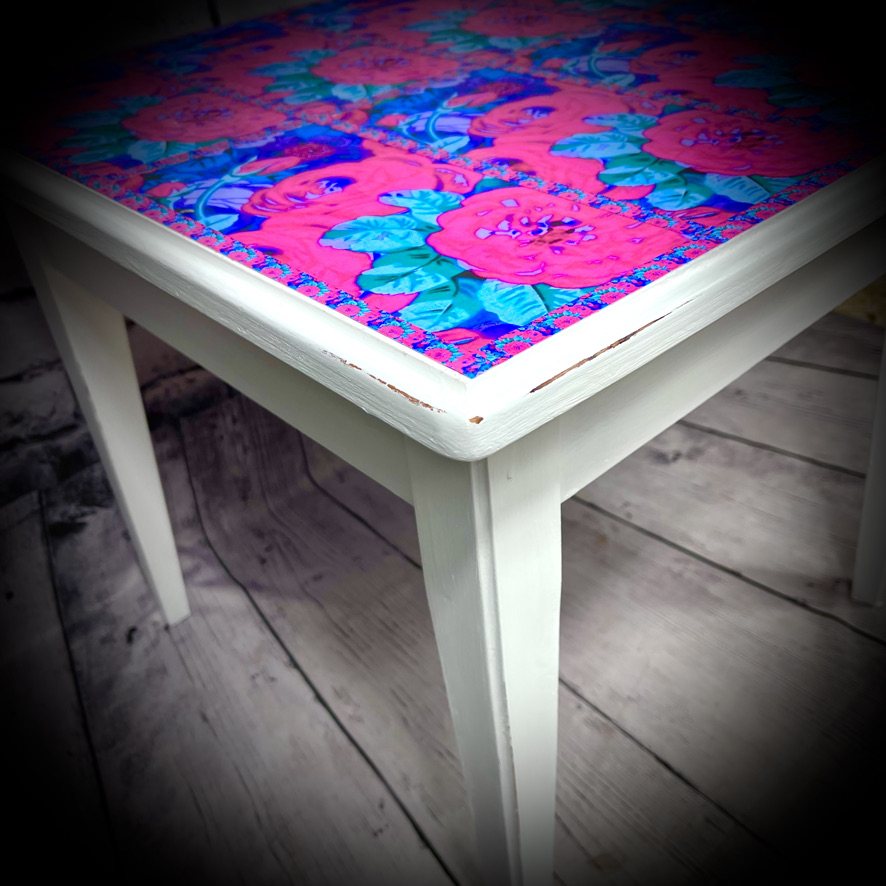 This plain wooden side table has been painted white, lightly distressed, and decoupaged in a colourful, vibrant ‘roses’ print – unique, stylish and standout!
