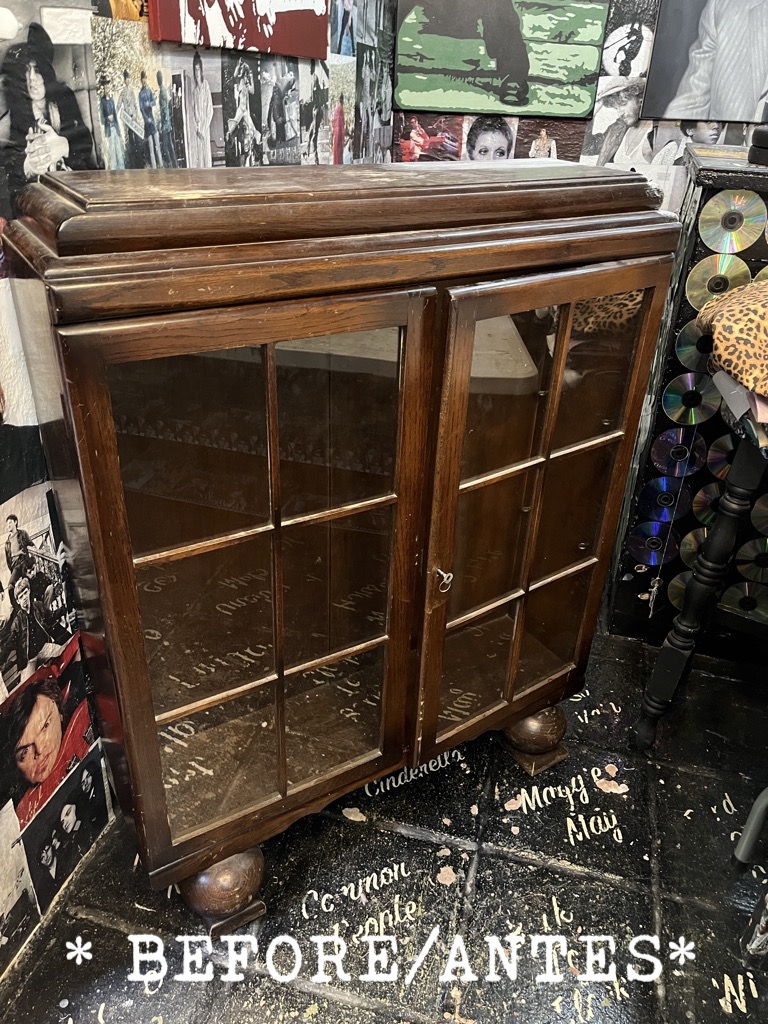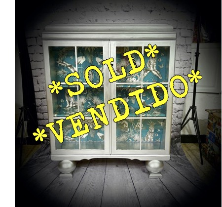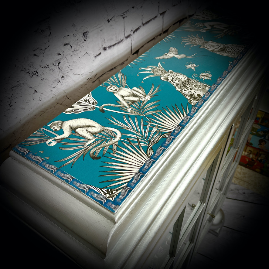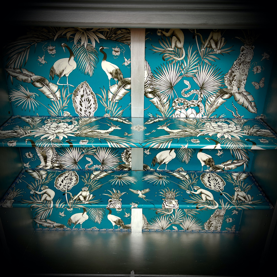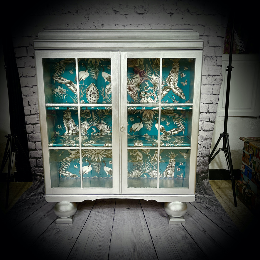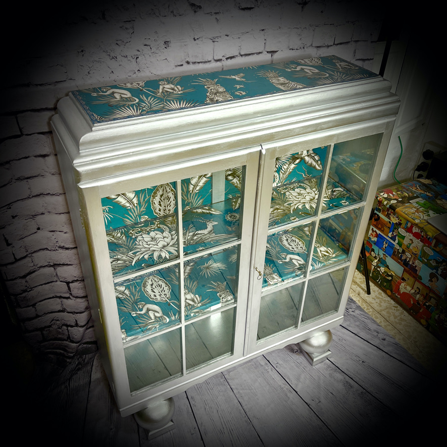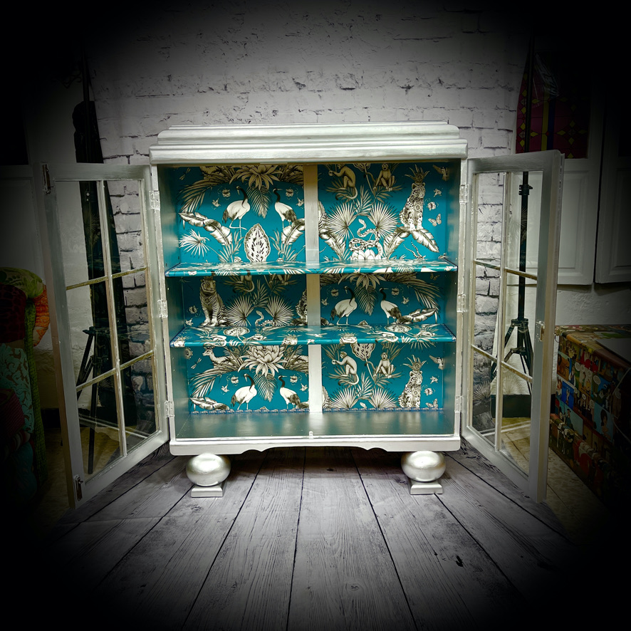 This glass-fronted display cabinet has been painted silver and the top and interior decorated with “Belgravia Menagerie” wallpaper in teal blue to make an absolutely stand-out and functional piece of furniture! A perfect place for your gin bottles and cocktail glasses!!!