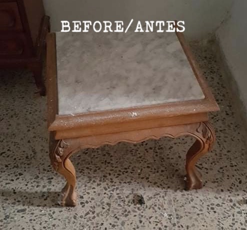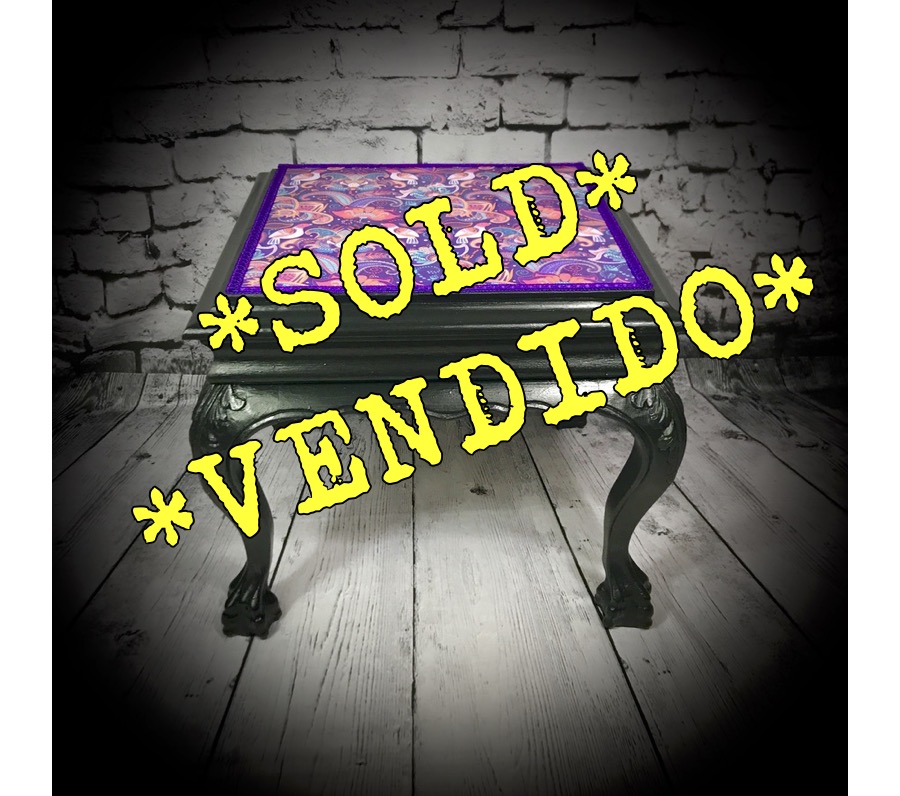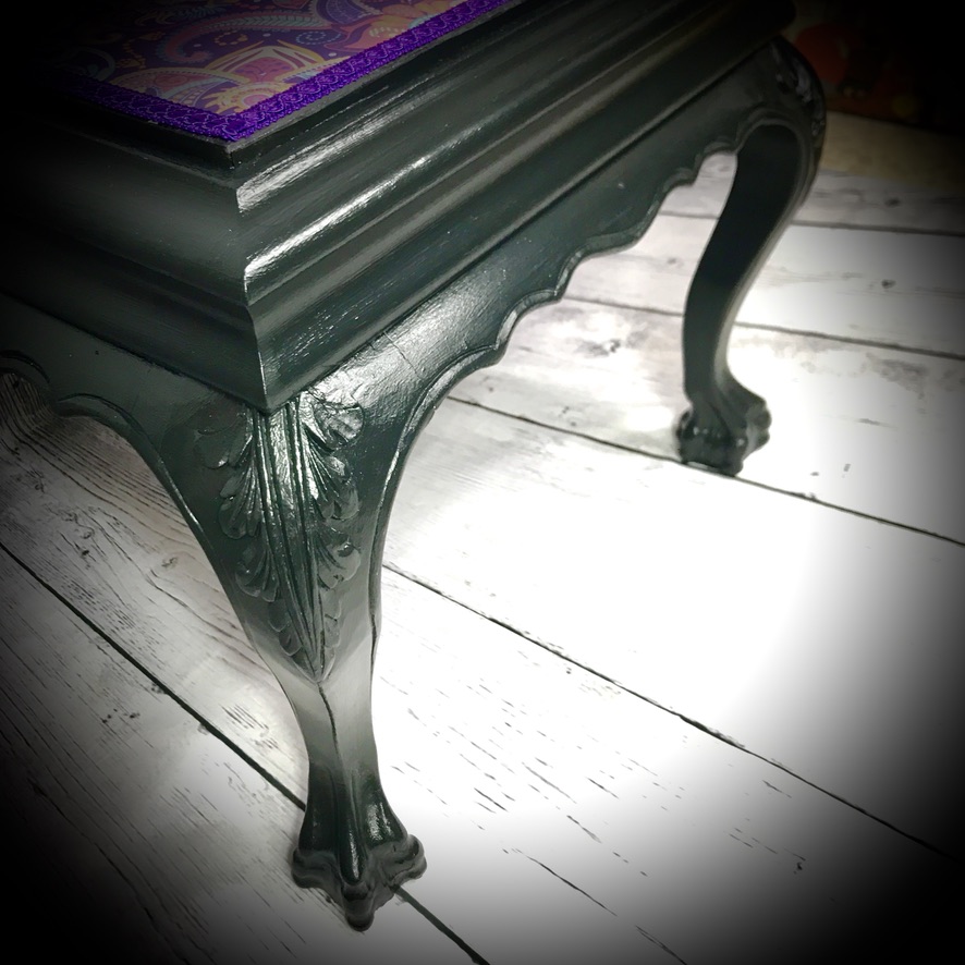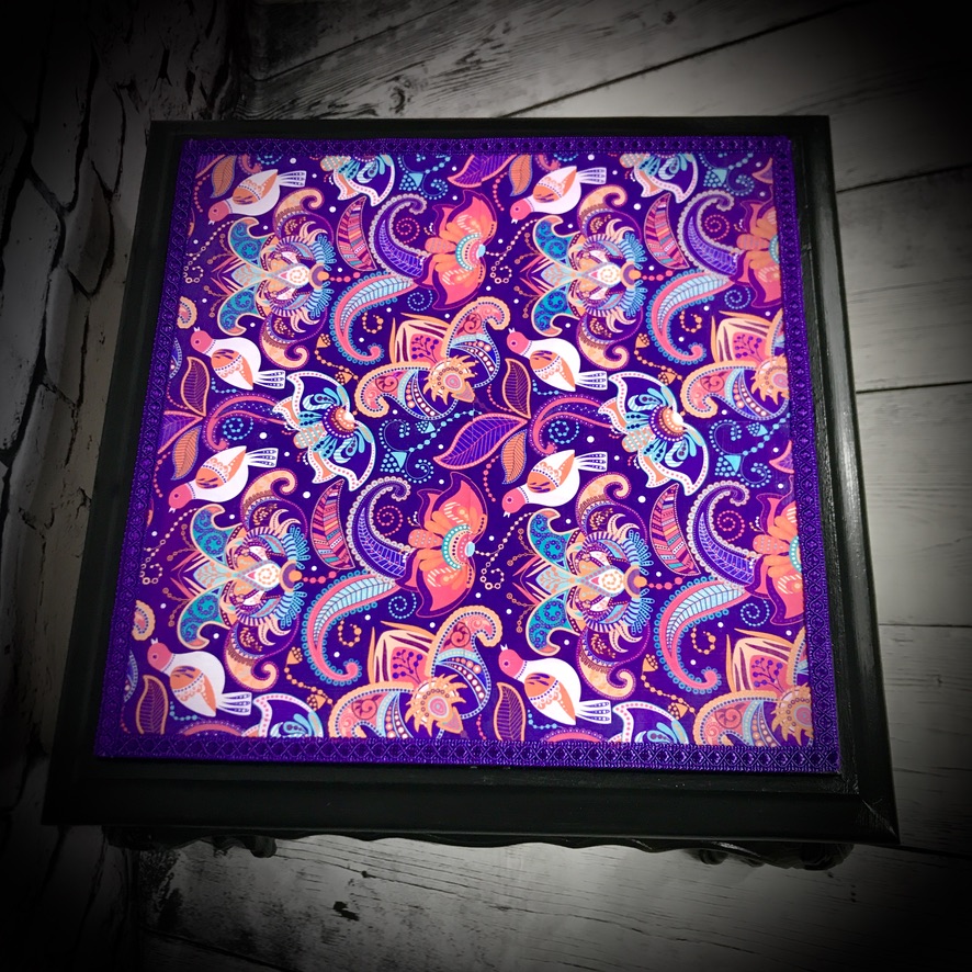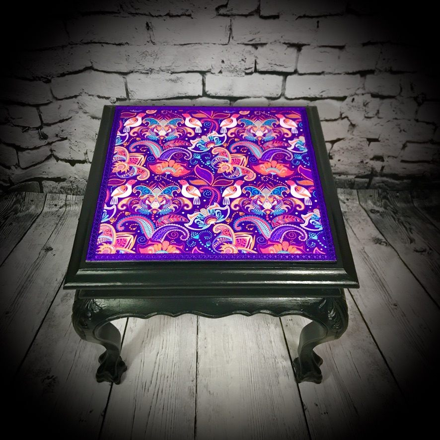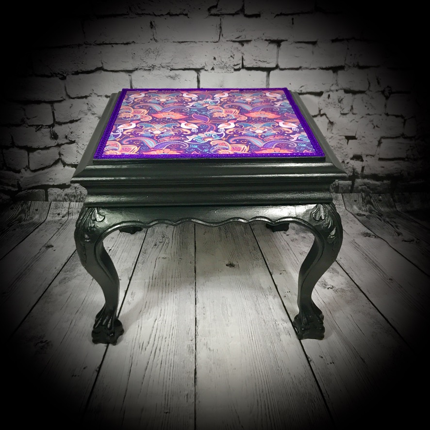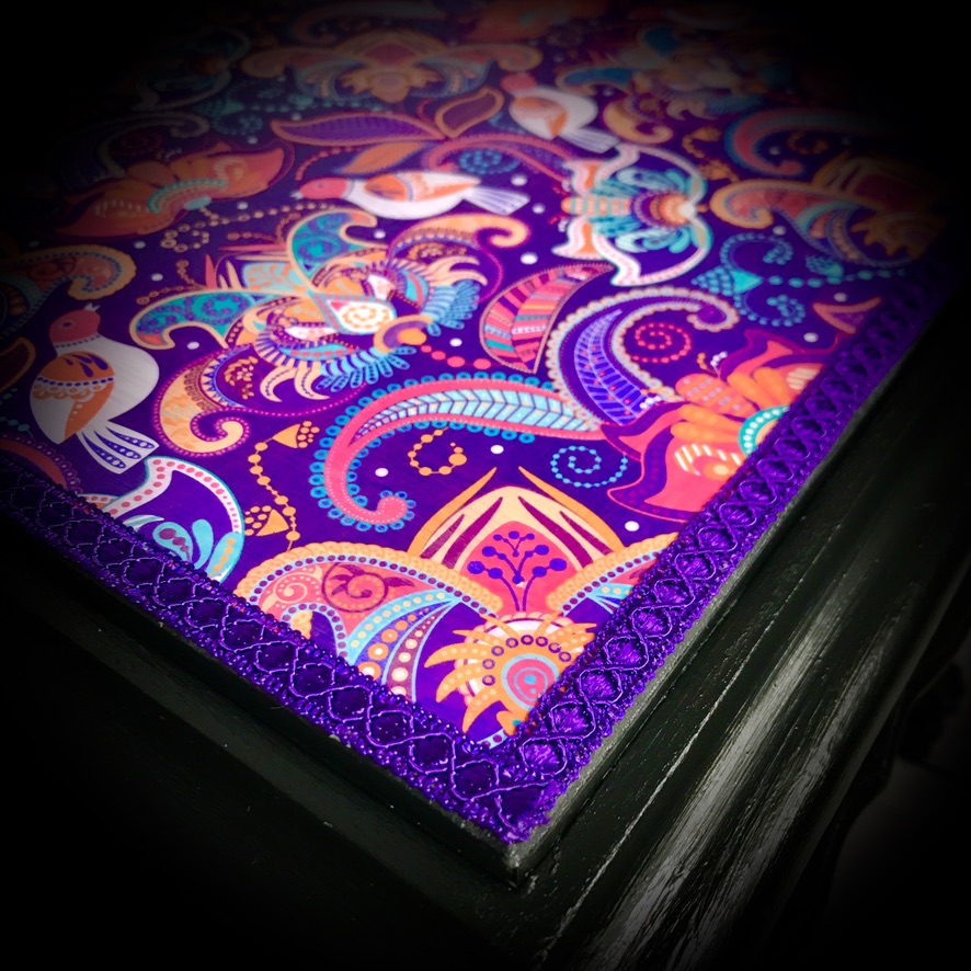 Another ’empty house’ rescue, this small wooden table with marble top has been given a black paint job and the marble top has been decoupaged with an Indian print, finished off with purple trimming to make a stylish and functional piece of furniture.