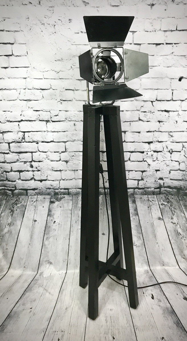This original theatre spotlight has been refurbished and mounted on a hand-made, black painted wooden stand, creating a striking and practical piece of furniture, standing at a height of 148 cms.