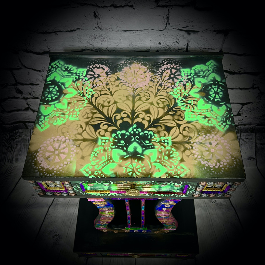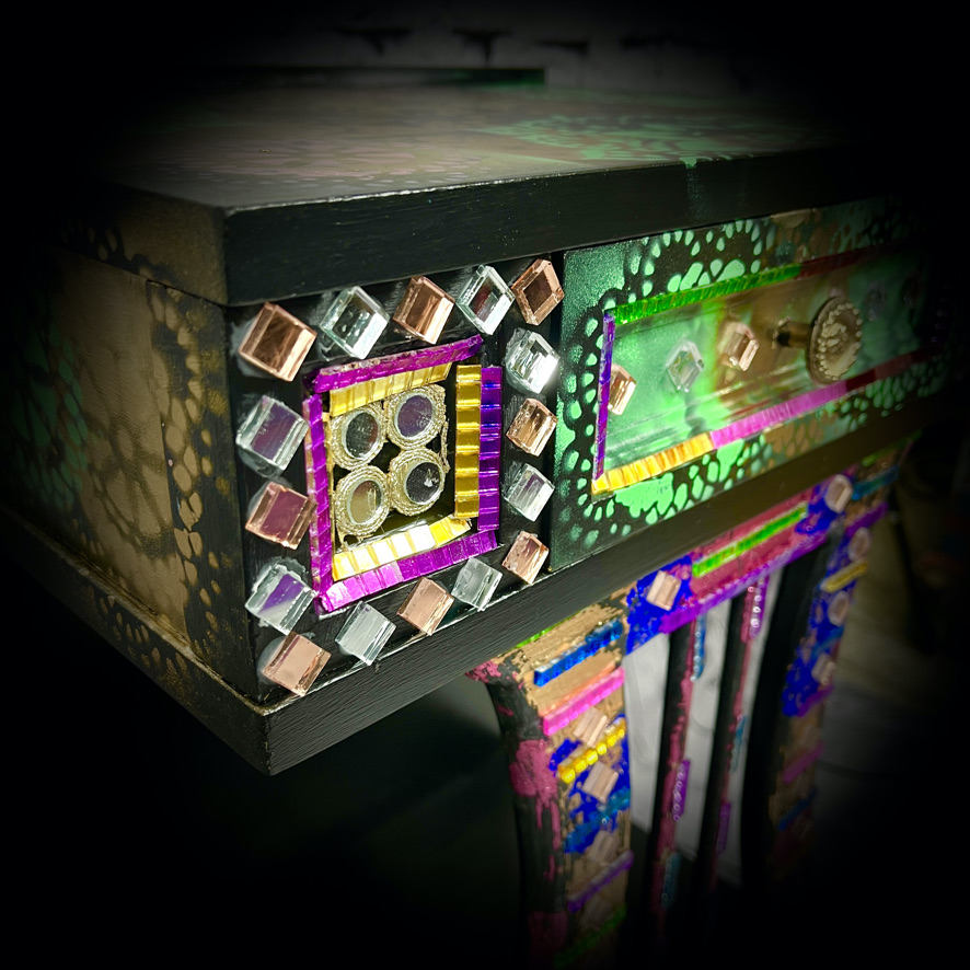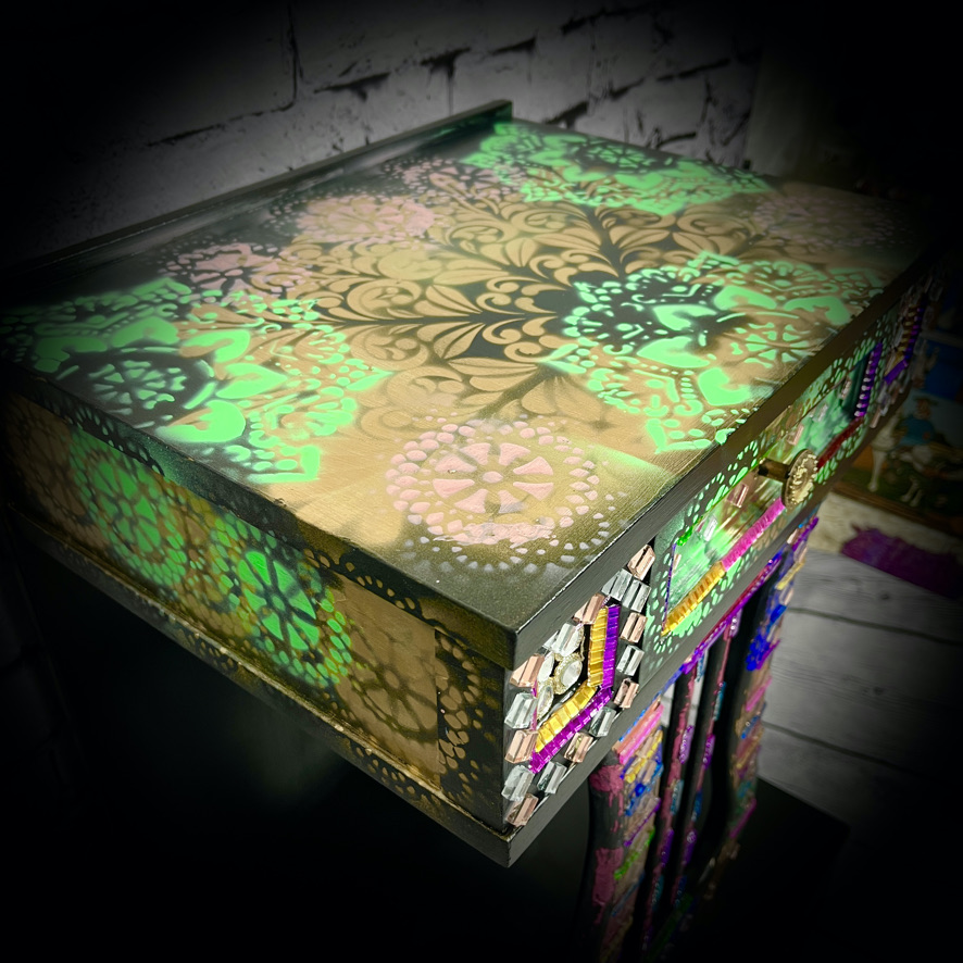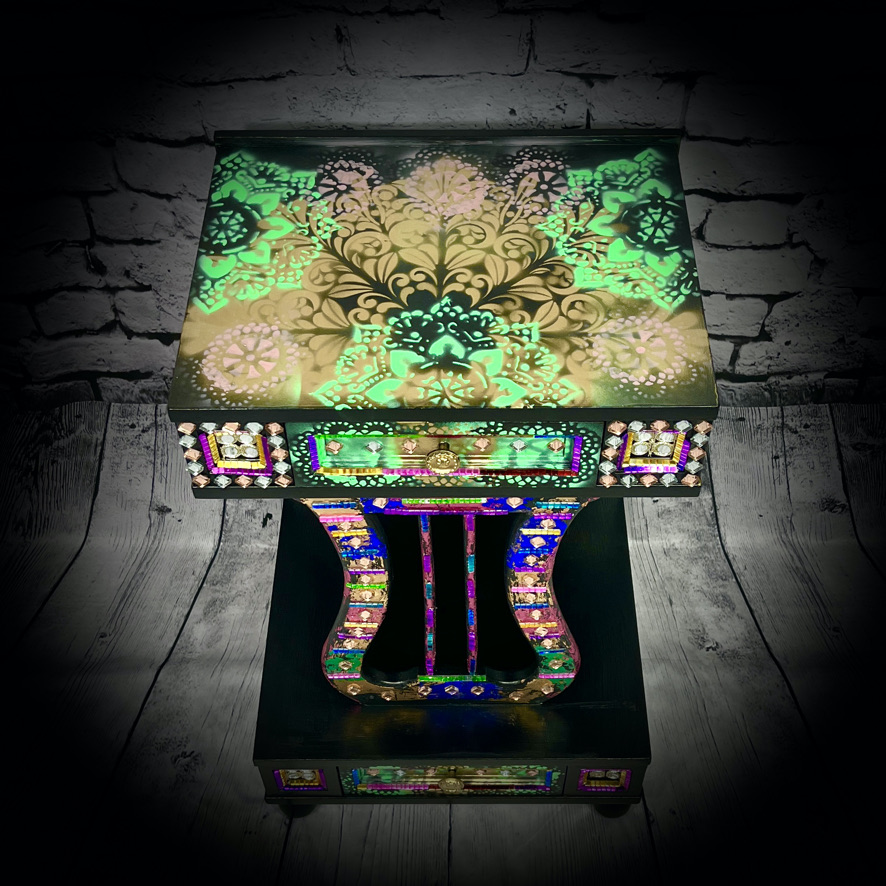 This unique unit with 2 drawers has been decorated with stencilling, coloured leaf and other items to create a stunning and practical piece of furniture.