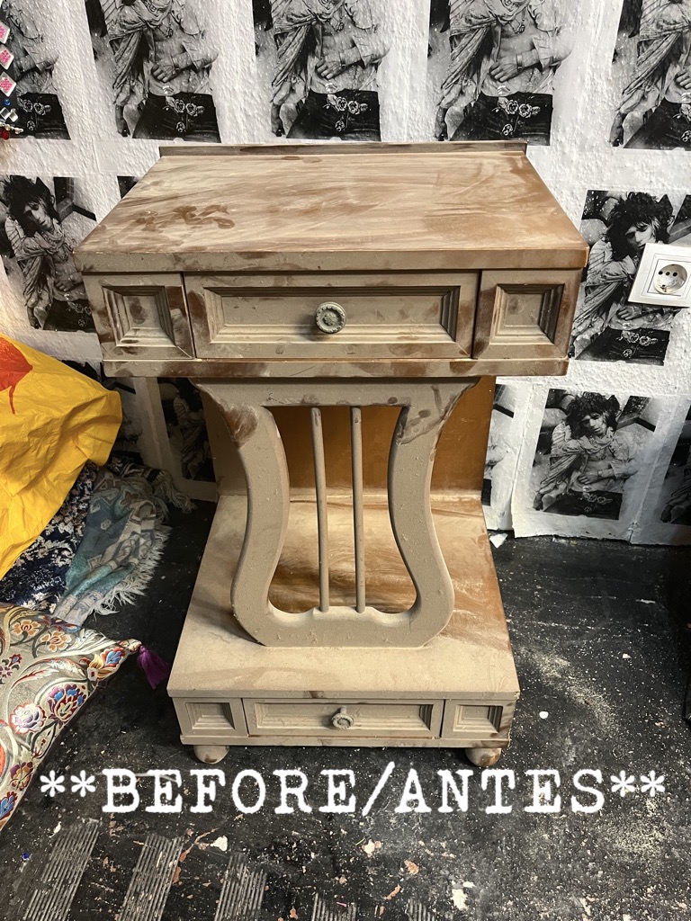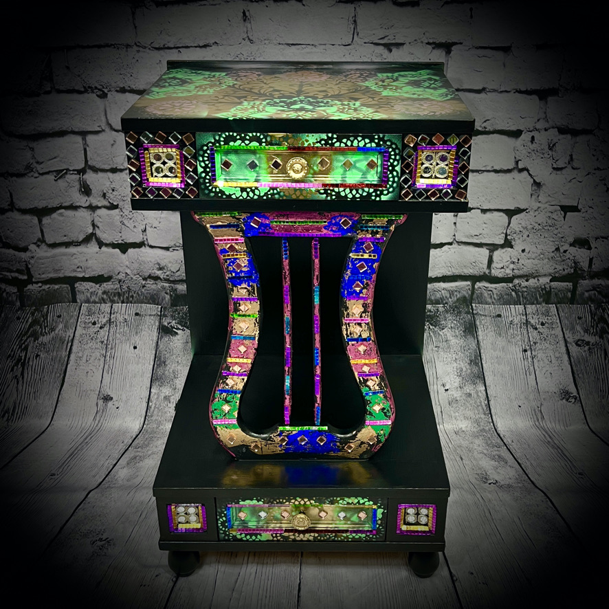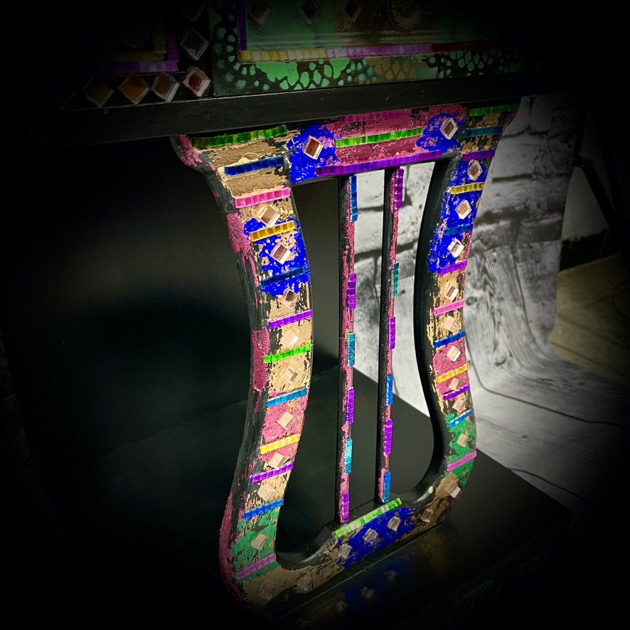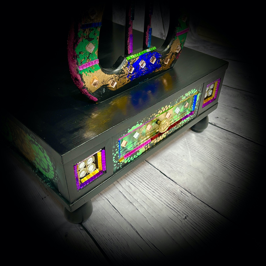 This unique unit with 2 drawers has been decorated with stencilling, coloured leaf and other items to create a stunning and practical piece of furniture.