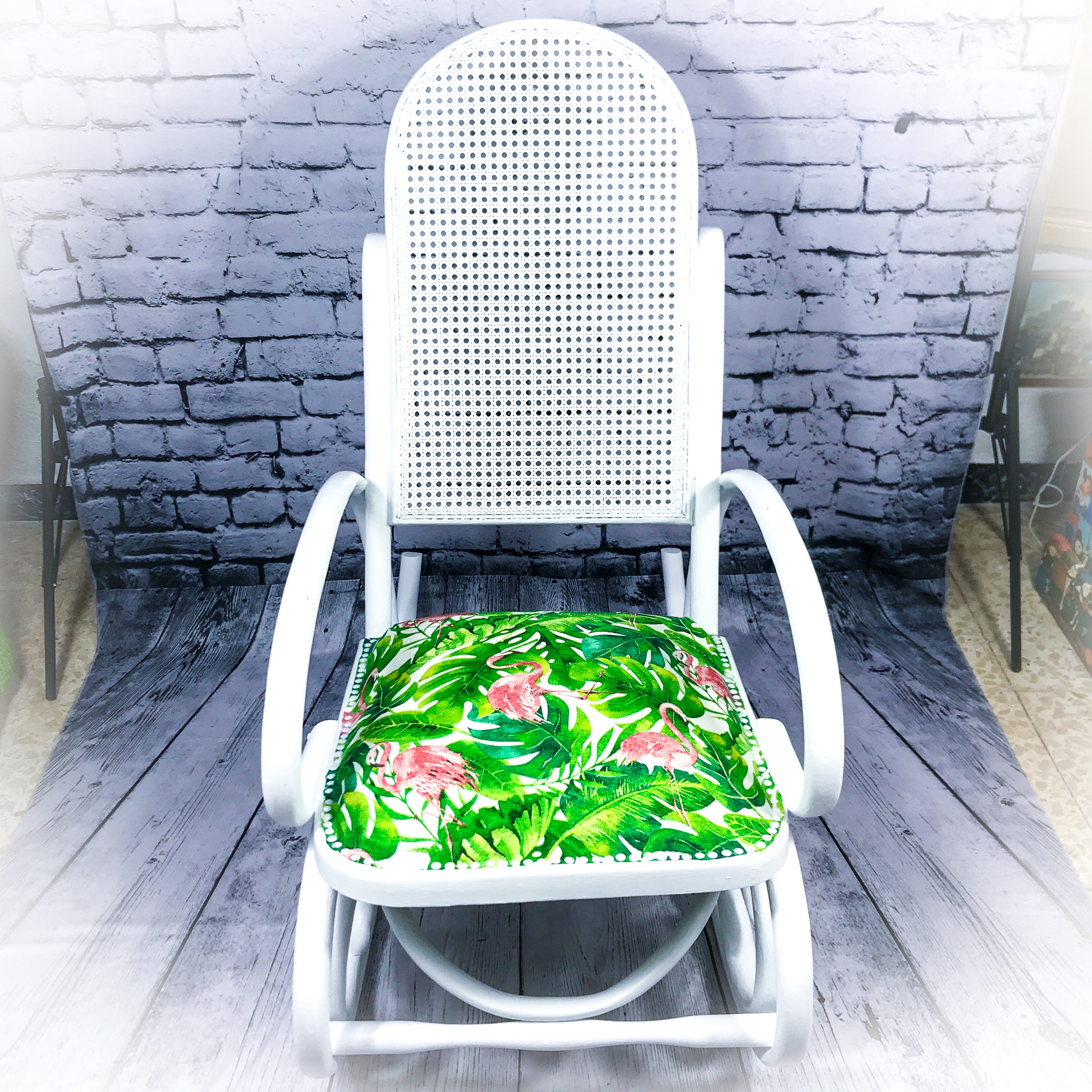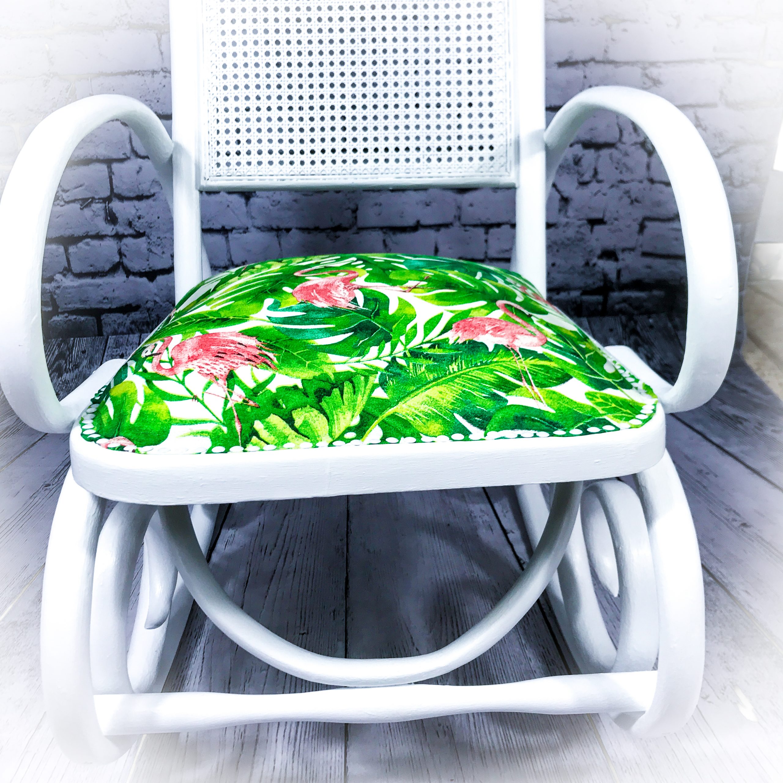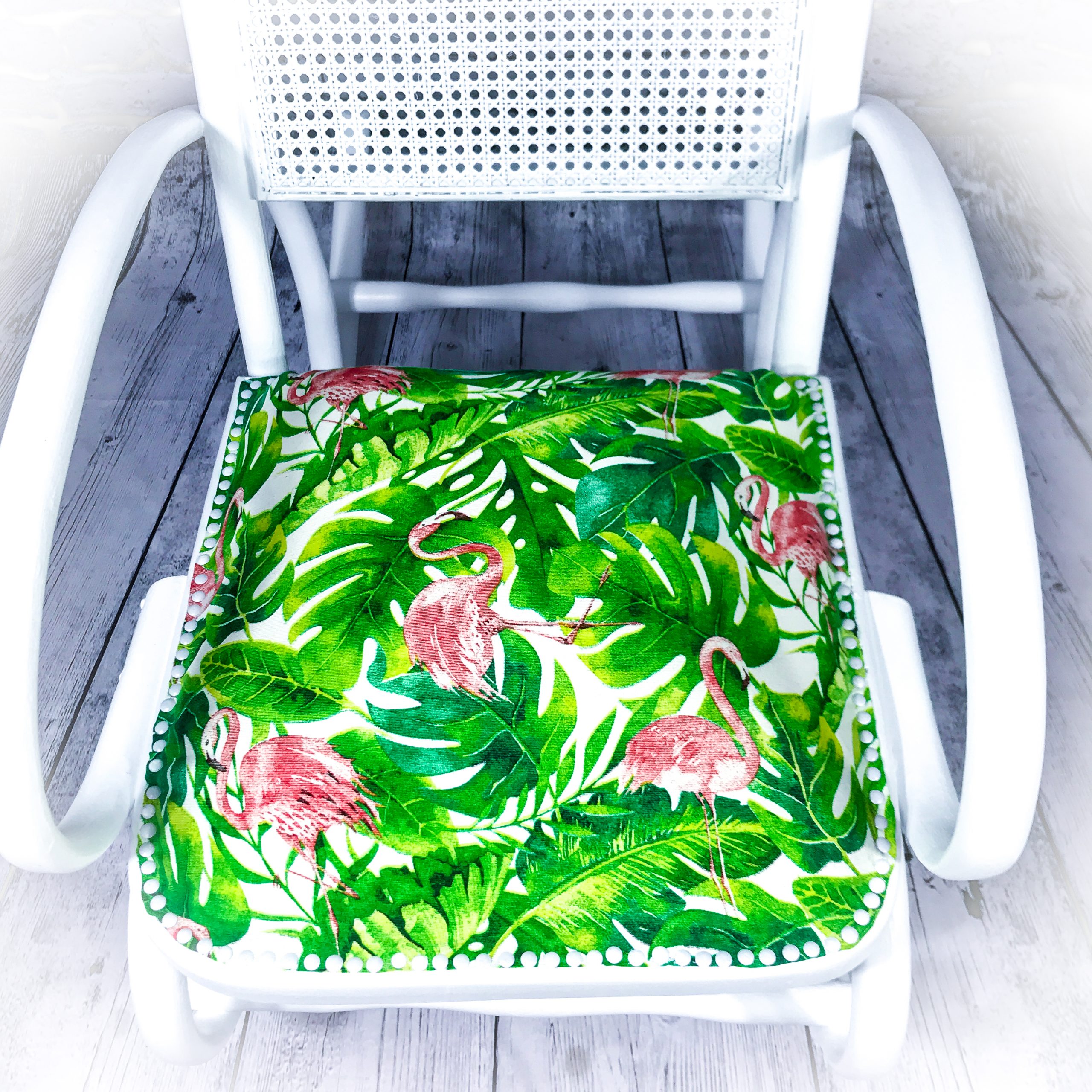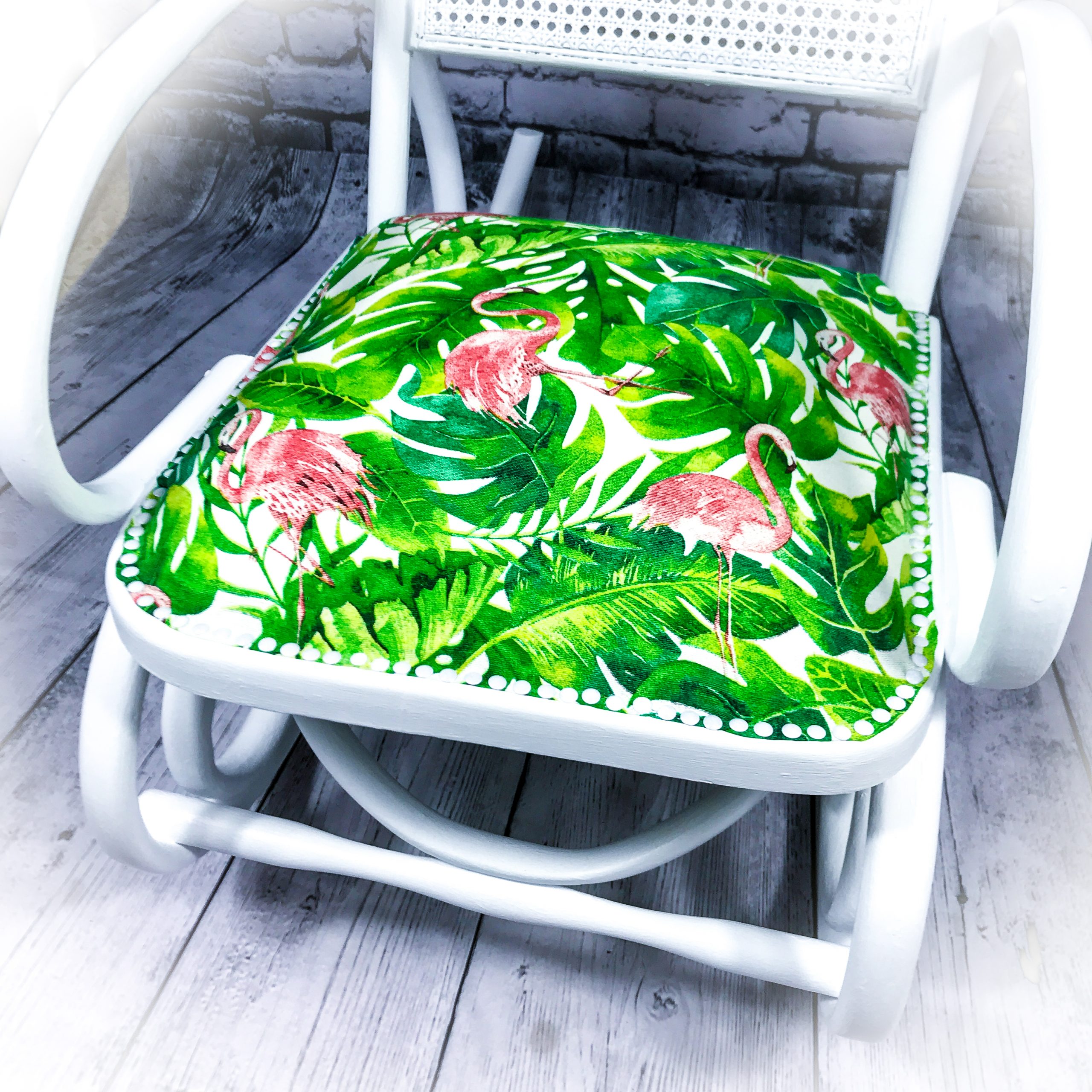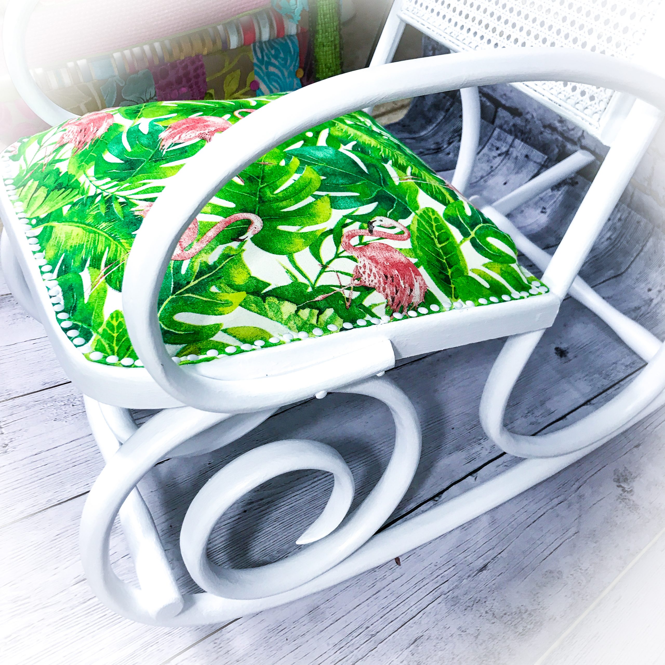 However, that was just the cue for a new lease of life for this elegant piece! A white paint makeover and a new upholstered seat area covered in a “flamingo and cheese plant” fabric giving it a real burst of colour!