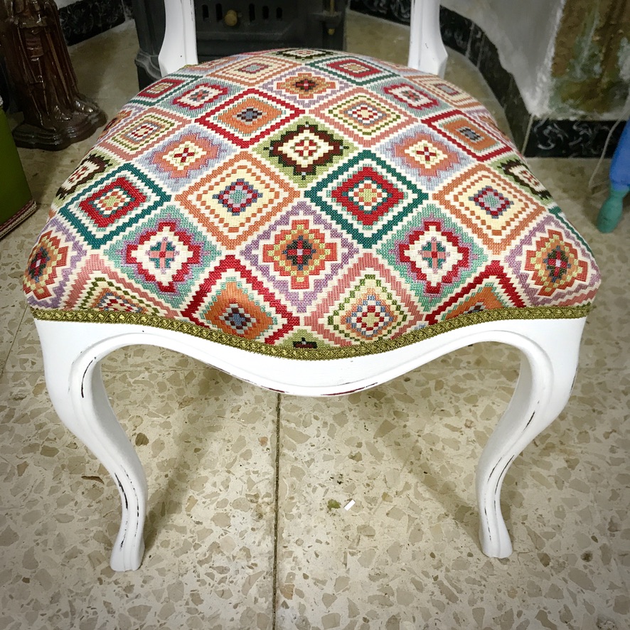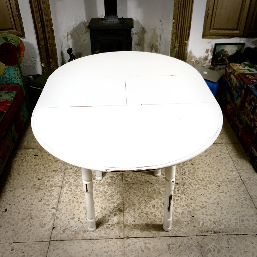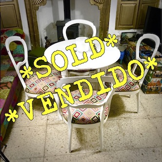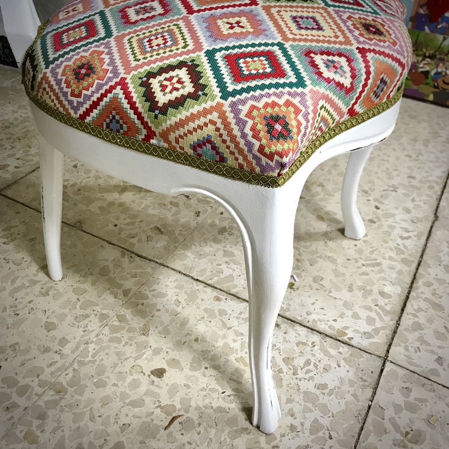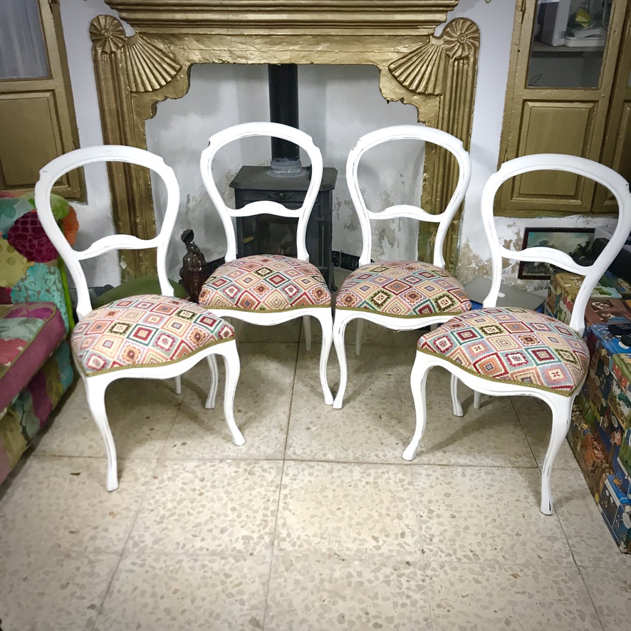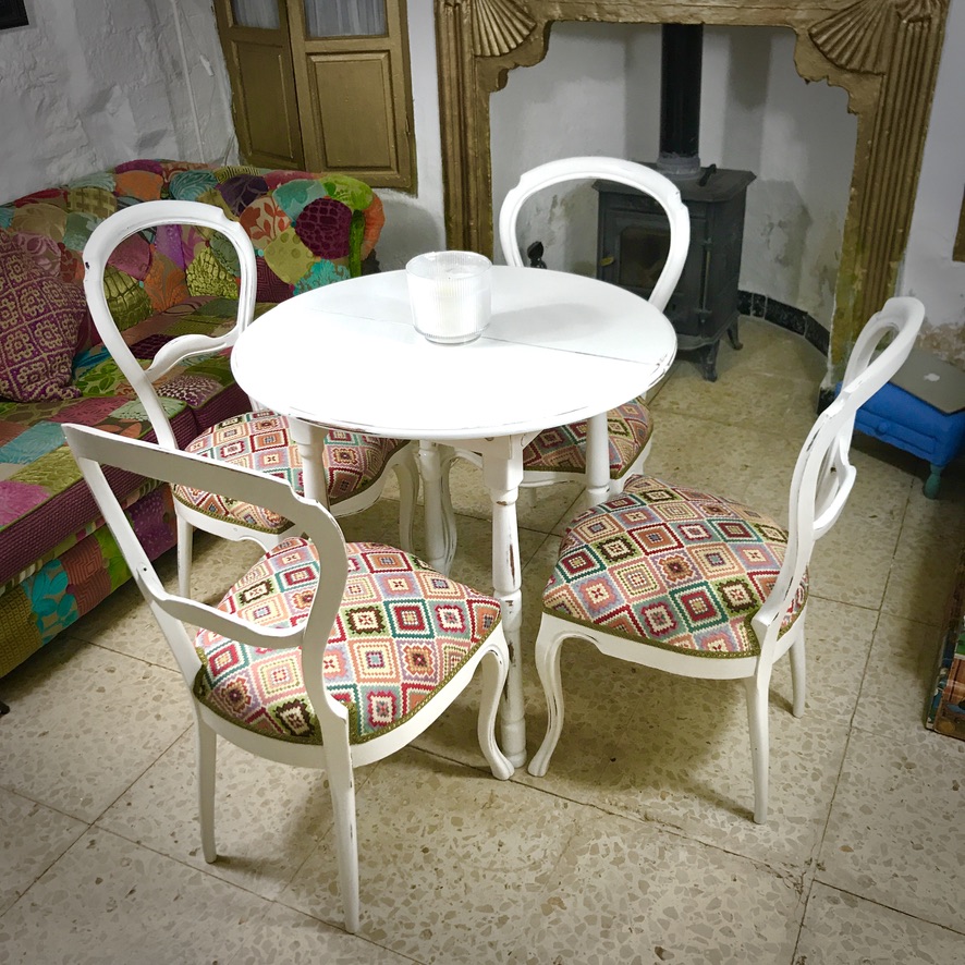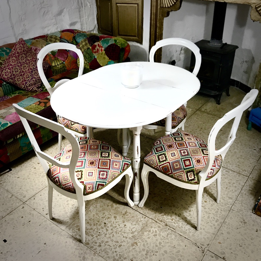 The table seats 4 and also extends. The chairs have been re-upholstered to provide very comfortable seating. All pieces are painted in white, lightly distressed and varnished for extra protection.
